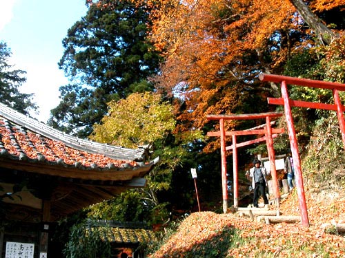 ![]() 大本殿への道の入口の大鳥居のキツネ像の前で |
