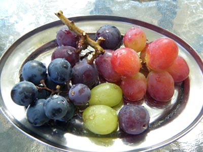 ↑垂れ下がった食べごろのぶどう ↑ぶどう園の見事なぶどうを試食 ↑ぶどう酒製造博物館で ↑ワイナリー白百合酒造で試飲 |