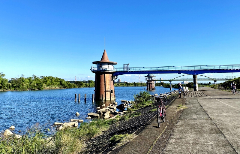 ![]() 葛飾柴又の水利使用標識の土手 |