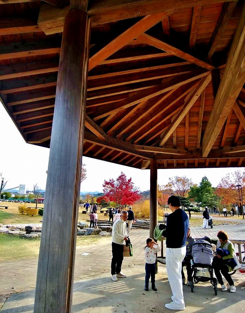 ![]() ぐるぐる公園のあずまやで休む家族 |