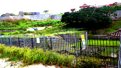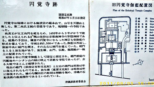 ↑円覚寺跡入口から総門を見る ↑円覚寺跡から首里城を望む | ↑円覚寺跡 総門 放生池石橋を望む ↑円覚寺跡 説明分と伽藍覇配置図 |