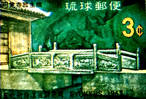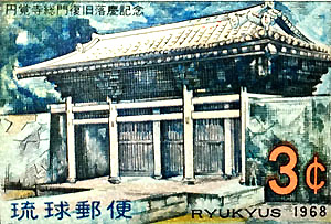 ↑円覚寺 総門右端から首里城を望む | ↑円覚寺総門 (復旧落慶記念切手) | ↑円覚寺 放生池石橋 (文化財保護強調週間) |