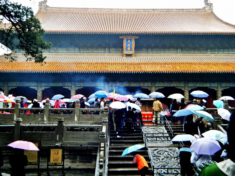 ↑孔廟に入る城門の前で ↑大成門の前に3つの門がある ↑大成殿(孔子の塑像を安置) ↑大成殿の孔子塑像 |