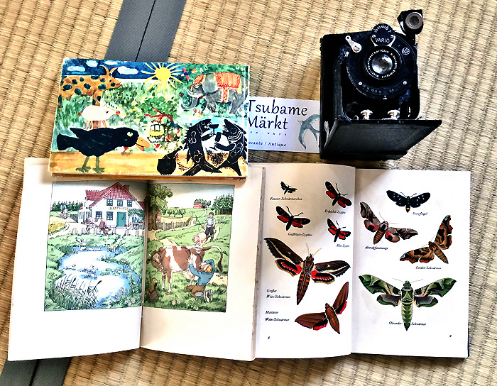 蚤の市で買った古い蛇腹カメラと80年前のドイツのグリム童話他の本 |